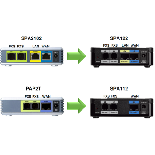 ATA адаптери серії SPA 112 та 122 замінять широко відомі моделі SPA2102 та PAP2T. Нагадаємо, що головною відмінністю моделі 2102 від PAP2T була наявність вбудованого маршрутизатора і відповідно LAN інтерфейсу для підключення пристроїв у локальній мережі.