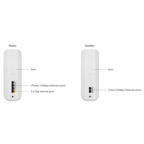 | Порти | Orbi Router: Три (3) порти 10/100/1000/2500 Мбіт/с MultiGig Ethernet LAN Один (1) 10/100/1000/2500 Мбіт/с Multi-Gig Порт Ethernet WAN Orbi Satellite: Два (2) 10/100/1000/2500 Мбіт/с Multi-Gig Порти Ethernet LAN (кожен) |