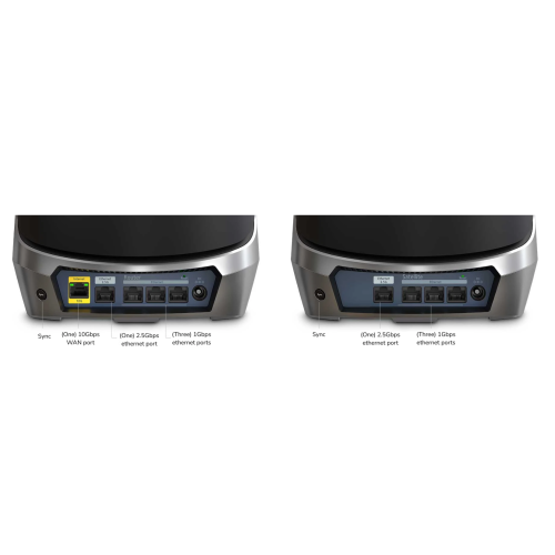| Порти | Orbi Router Один (1) порт WAN Multi-Gitbit Ethernet 10 Гбіт/с Один (1) порт LAN Multi-Gigabit Ethernet 2,5 Гбіт/с Три (3) порти 10/100/1000 Мбіт/с Gigabit Ethernet LAN Orbi Satellites (кожен): Один (1) порт LAN Multi-Gigabit Ethernet 2,5 Гбіт/с Три (3) порти 10/100/1000 Мбіт/с Gigabit Ethernet LAN |