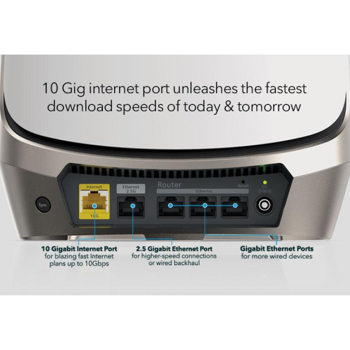 Чотирьохдіапазонний маршрутизатор Orbi 960 із підтримкою Mesh-Ready Wi-Fi 6E, «швидкісною смугою» Wi-Fi 6E та 10-гігабайтовим дротовим інтернет-портом забезпечує надвисоку швидкість і величезну ємність пристрою. Завдяки комбінованій блискавичній швидкості Wi-Fi до 10,8 Гбіт/с на площі до 280 м² ви зможете насолоджуватися найдивовижнішими враженнями від Wi-Fi. Захистіть дані, конфіденційну інформацію та пристрої за допомогою відзначеної нагородами NETGEAR Armor Internet Security.