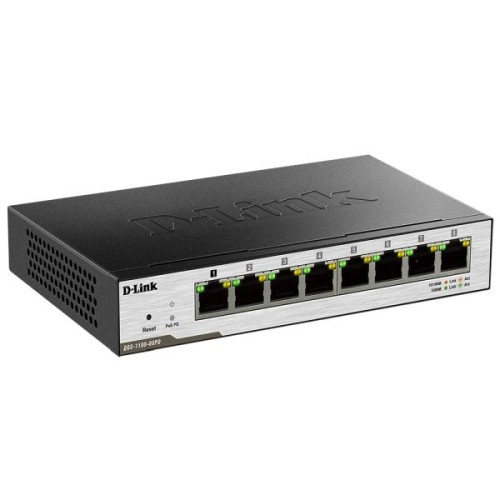 Настроюваний комутатор EasySmart DGS-1100-08PD призначений для мереж малого та середнього бізнесу, філій і переговорних кімнат, де потрібне просте керування та компактне рішення. Підтримка живлення по PoE дозволяє встановлювати пристрій у місцях без електричних розеток і зменшити кількість кабелів. Комутатор виконаний у міцному металевому корпусі з пасивним охолодженням для безшумної роботи.