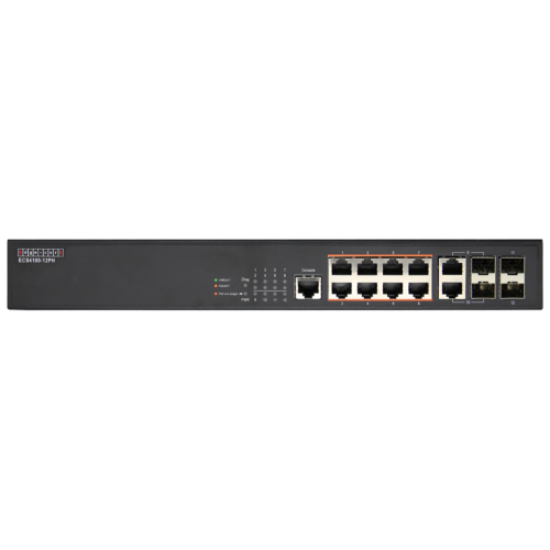 Модель ECS4100-12PH підтримує PoE+ та UPoE, забезпечуючи до 60 Вт потужності на порт, що дозволяє живити IP-камери, точки доступу та інші PoE-пристрої без додаткових адаптерів.