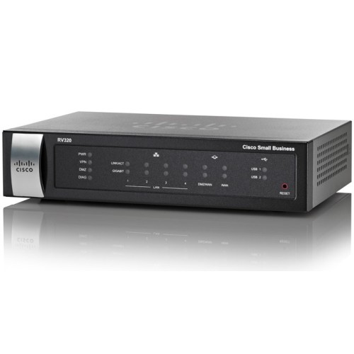 Cisco Small Business Cisco RV320-WB-K9-G5 (4 LAN GE, 1 WAN GE, 1 DMZ/WAN GE, 2 USB 3G/4G/LTE) - маршрутизатор має 4 LAN GE порти, 1 WAN GE порт, 1 DMZ/WAN GE порт, 2 USB порти для 3G/4G модем, а також вбудований Web-Filtering. 20,000 одночасних з'єднань через VPN.