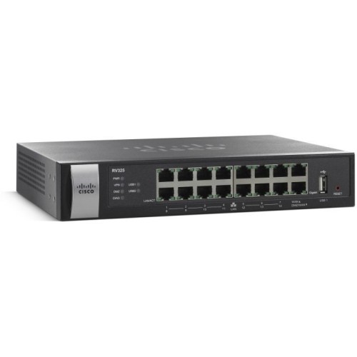 Cisco Small Business Cisco RV325-WB-K9-G5 (14 LAN GE, 1 WAN GE, 1 DMZ/WAN GE, 2 USB 3G/4G/LTE) - маршрутизатор має 4 LAN GE порти, 1 WAN GE порт, 1 DMZ/WAN GE порт, 2 USB порти для 3G/4G модем, а також вбудований Web-Filtering. 40,000 одночасних з'єднань через VPN.