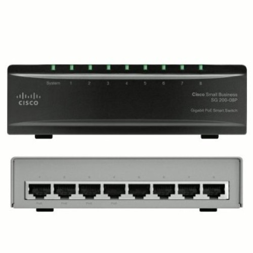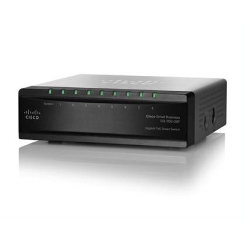 Cisco SG200-08P (8-Port Gigabit Smart Switch) - Smart комутатор на 8 GE портів. Є можливість установки в 19 дюймову стійку. PoE не підтримує. Підтримує PoE (4 PoE з 8 портів).