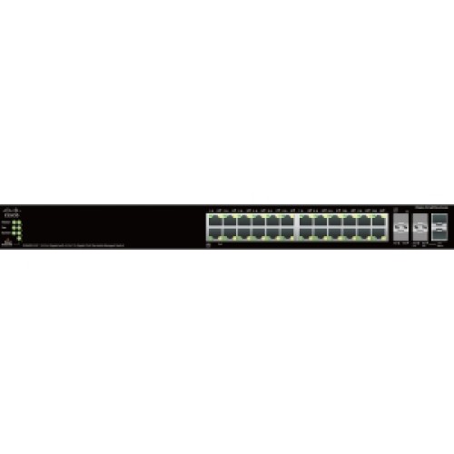 Стекові керовані комутатори нової серії Cisco Small Business 500 забезпечують істотне розширення комутаційних можливостей для малих і середніх підприємств. Дана модель оснащена 24 гігабітними портами і 4 гігабітними комбо портами. Комутаційна здатність свіча становить 128 Гбіт/с, продуктивність перадресаціі: 95,24 млн. пакетів в секунду. Кожен з 24 гігабітних портів комутатора підтримує PoE.