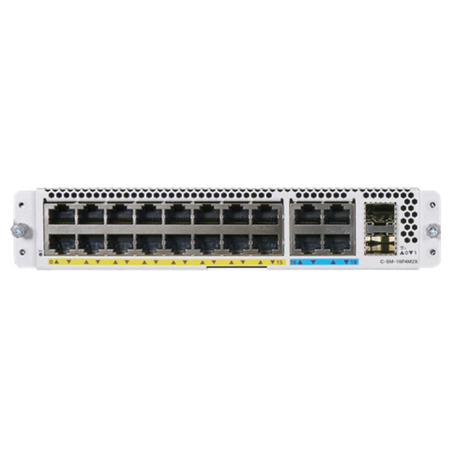 C-SM-16P4M2X — це односекційний комутаційний SM-модуль для платформ Cisco Catalyst 8300 Series, що забезпечує інтегроване LAN-комутування корпоративного рівня. Модуль оснащений 16 портами Gigabit Ethernet, 4 портами 2.5G Multigigabit та двома аплінк-портами 10G SFP+ для високошвидкісних підключень.