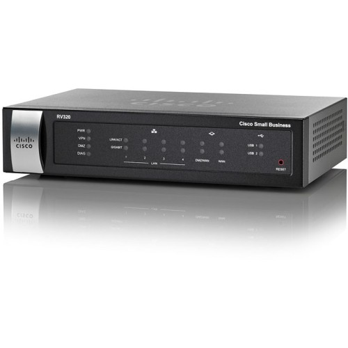 Cisco Small Business Cisco RV320-K9-G5 (4 LAN GE, 1 WAN GE, 1 DMZ/WAN GE, 2 USB 3G/4G/LTE) - Маршрутизатор має 4 LAN GE порти, 1 WAN GE порт, 1 DMZ/WAN GE порт, 2 USB порти для 3G/4G модему. 20,000 одночасних з'єднань через VPN.