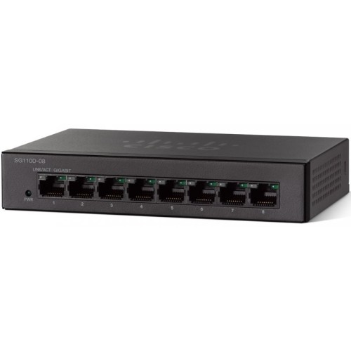 Cisco SG110D-08 (8-Port GigabitDesktopSwitch) - настільний некерований комутатор на 8 гігабітних портів. PoE не підтримує.