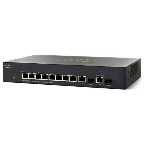 Cisco SG200-10FP (10-Port Gigabit PoE Smart Switch with 2x GE Combo) -Smart комутатор на 10 GE портів і 2 комбо-порти 1000Base-T/SFP *. Є можливість установки в 19 дюймову стійку. Підтримує PoE (8 PoE з 10 портів).
