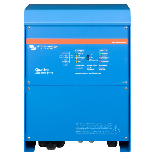 Подібно до MultiPlus, Quattro також є комбінованим інвертором і зарядним пристроєм. Крім того, він може приймати два входи змінного струму та автоматично підключатися до активного джерела. Його численні функції включають справжній синусоїдний інвертор, адаптивну зарядку, гібридну технологію PowerAssist, а також численні функції системної інтеграції, такі як трифазна або розділена фаза та паралельна робота.