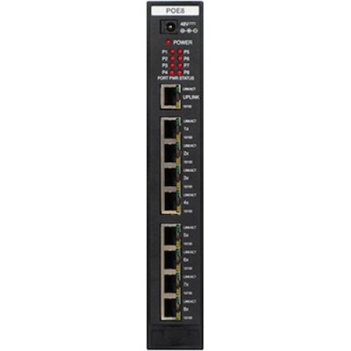 Вісім портів LAN модуля оснащені ланцюгами подачі напруги живлення (48 В) на системний IP-телефон або DSS-консоль серії LIP по кабелю LAN. Електроживлення автоматично подається на термінали відповідно до специфікації IEEE 802.3af Powered Device - PD (Пристрій-споживач). Світлодіодні індикатори на передній панелі модуля відображають стан подачі електроживлення для кожного порту. Порт UPLINK LAN не обладнано ланцюгом подачі електроживлення.