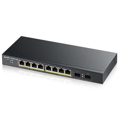 Zyxel G S 1900 - 10HP ( 8 -Port Gigabit PoE + 2 SFP ports Smart Managed Switch) - комутатор на 8 GE порт ів і 2 SFP порту . Підтримка QoS дозволяє виявити і запобігти помилкам в роботі мережі. Пасивне охолодження, дозволяє знизити рівень шуму. Підтримка PoE присутній (8 порту PoE ).